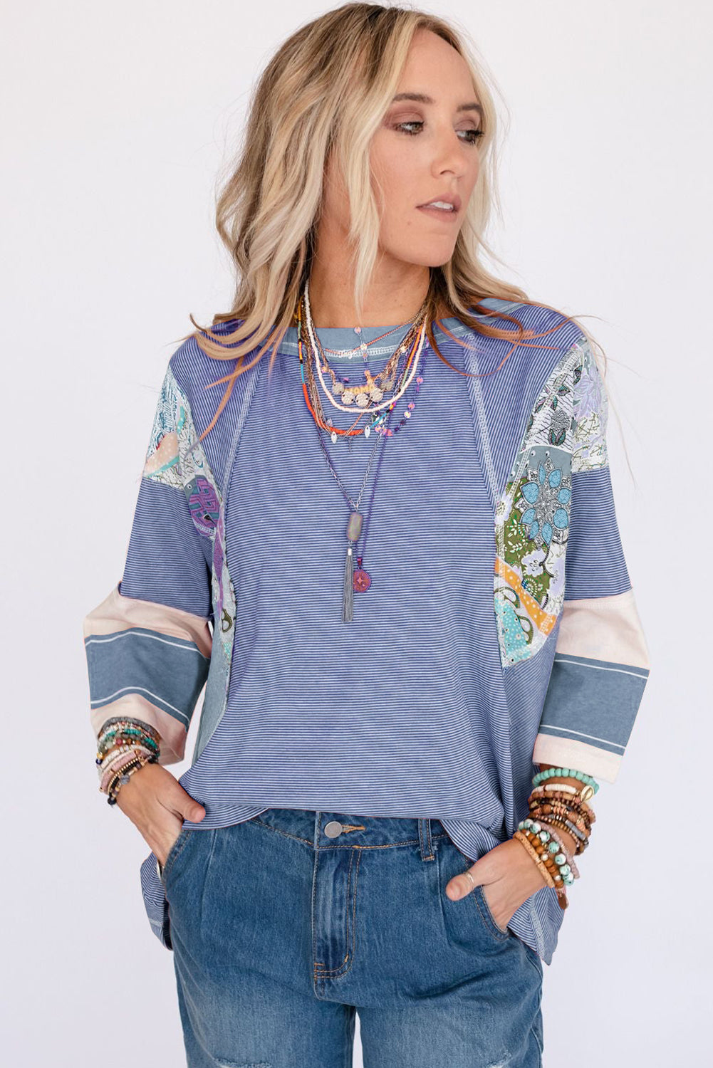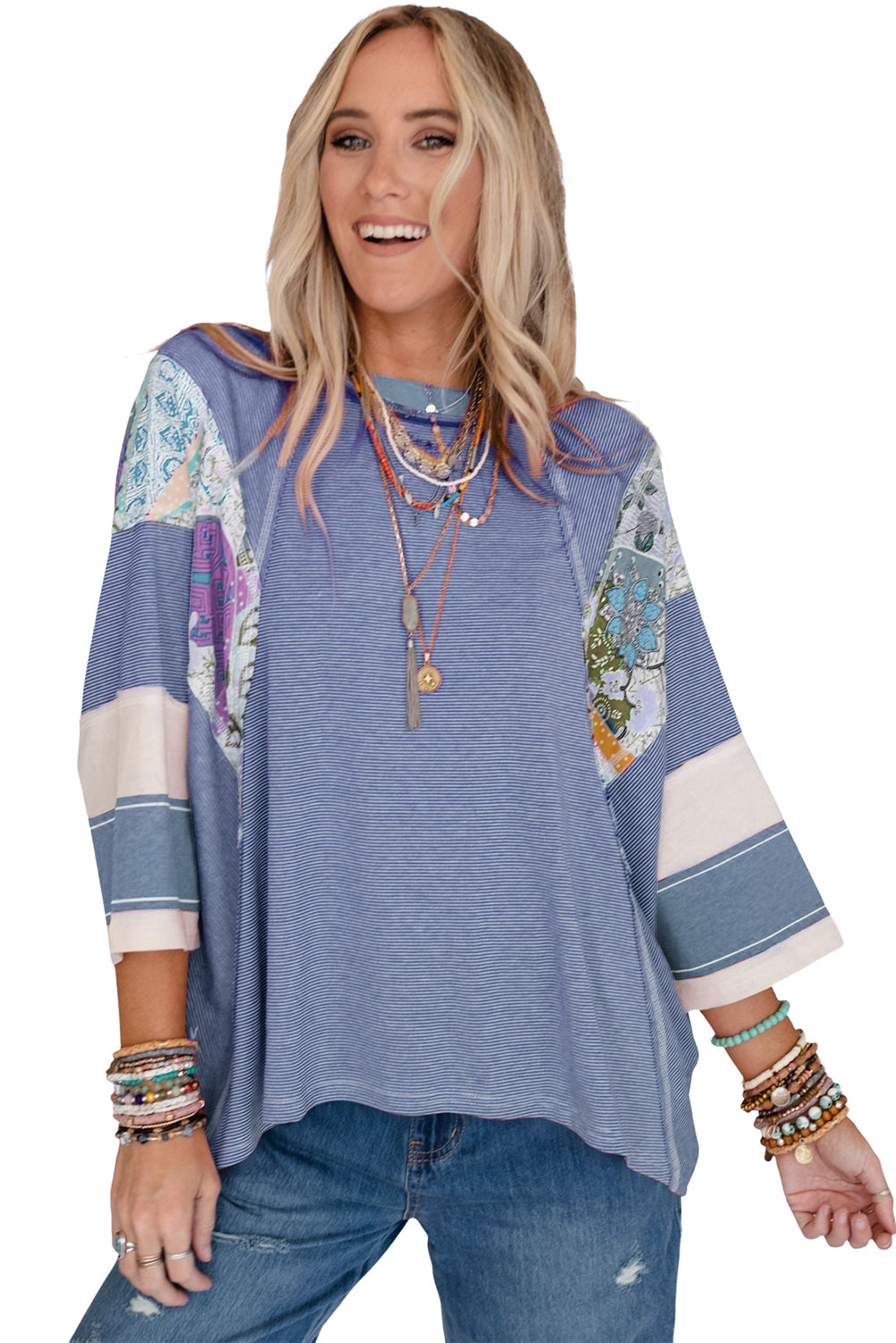 Sky Blue Printed Pinstriped Color Block Patchwork Oversized Top