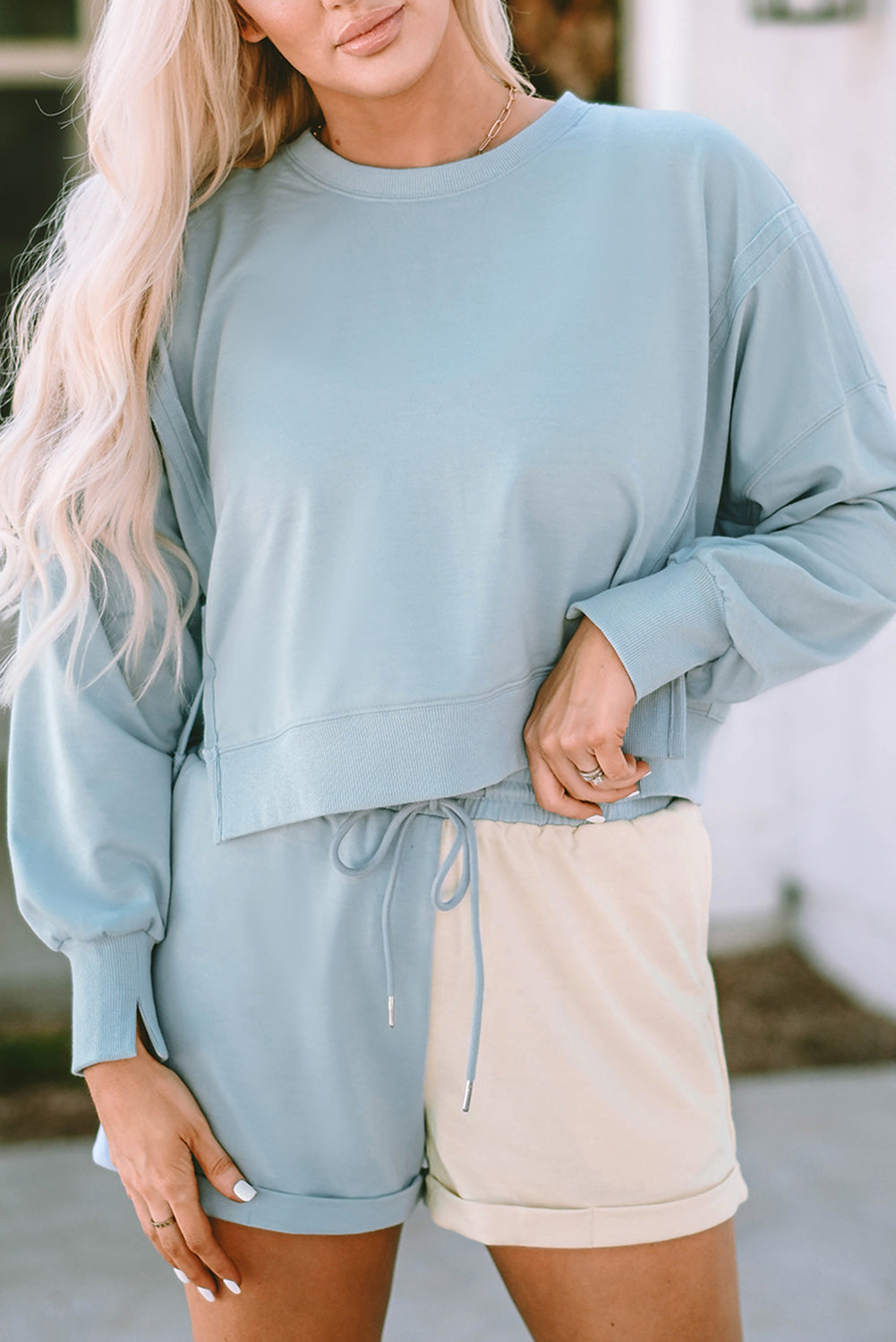 Sky Blue Split Hem Sweatshirt Color Block Shorts Set