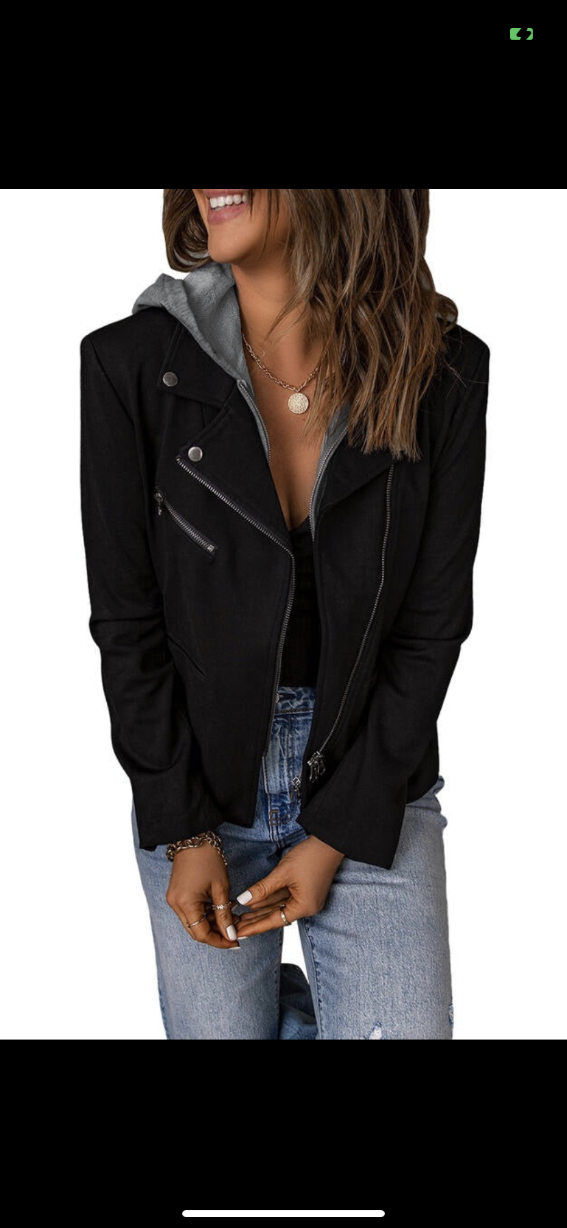 Black collar jacket with a detachable hood with zip up sleeves. Made of 100% polyester