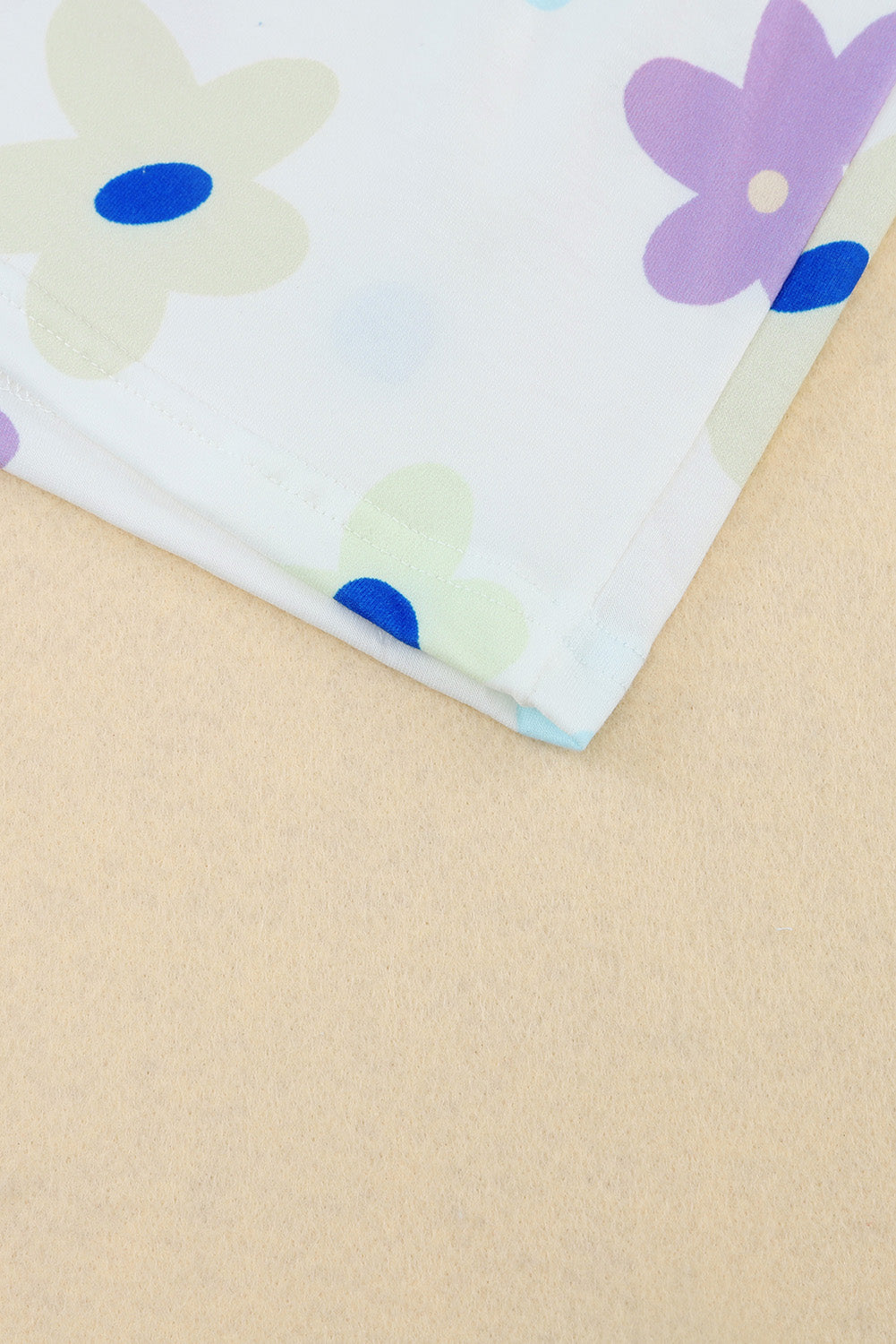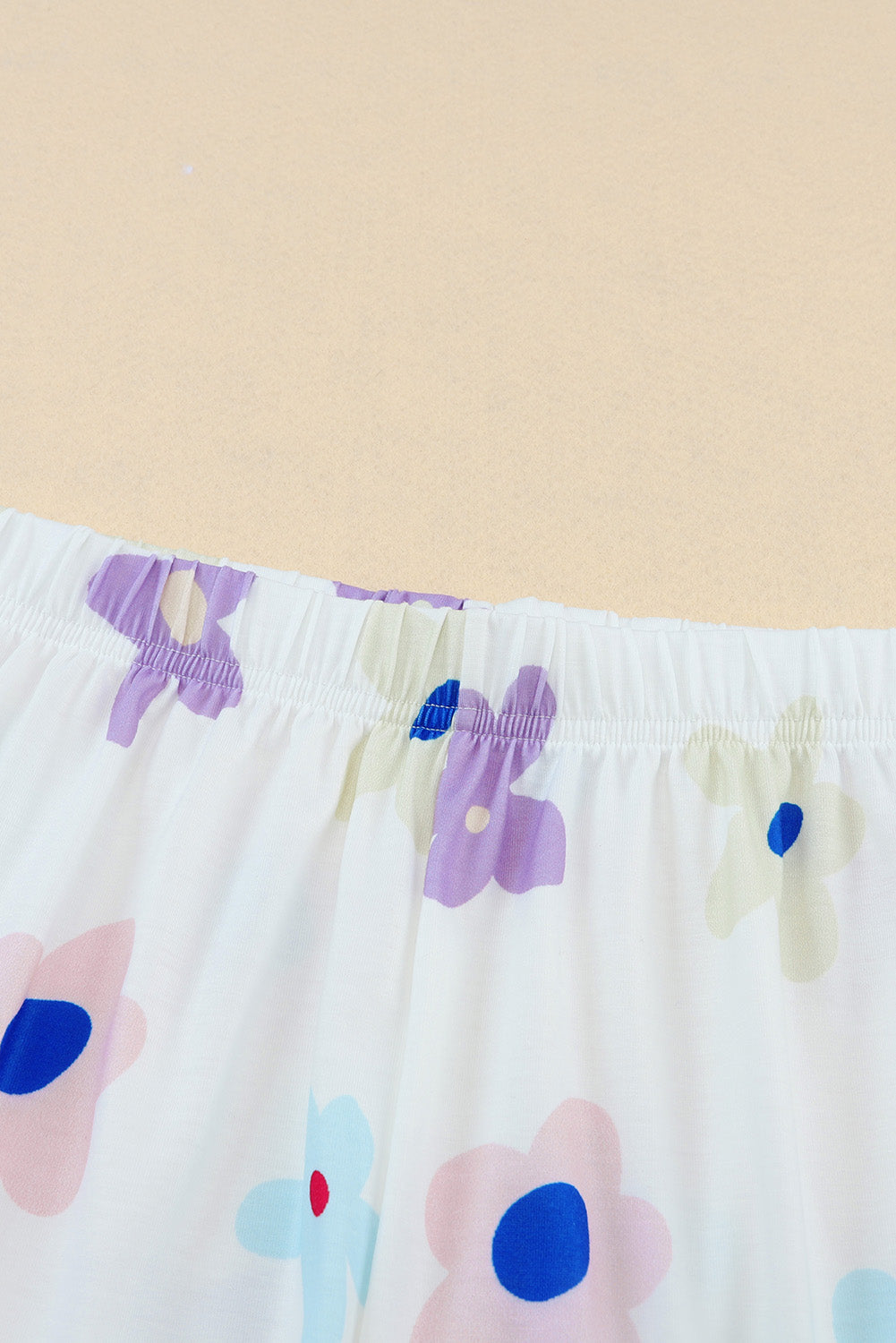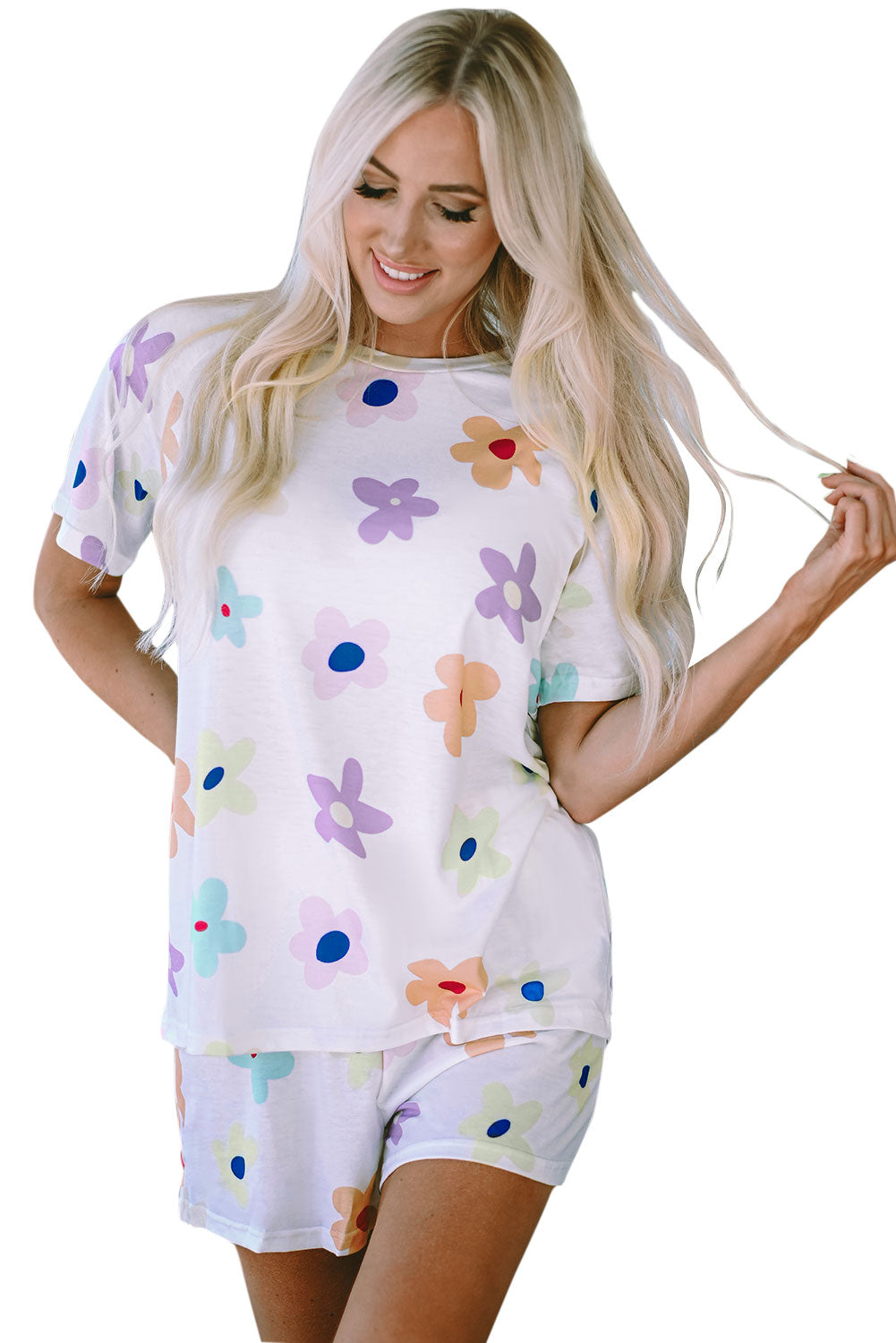 White Flower Print Short Sleeve High Waist Two Piece Shorts Set