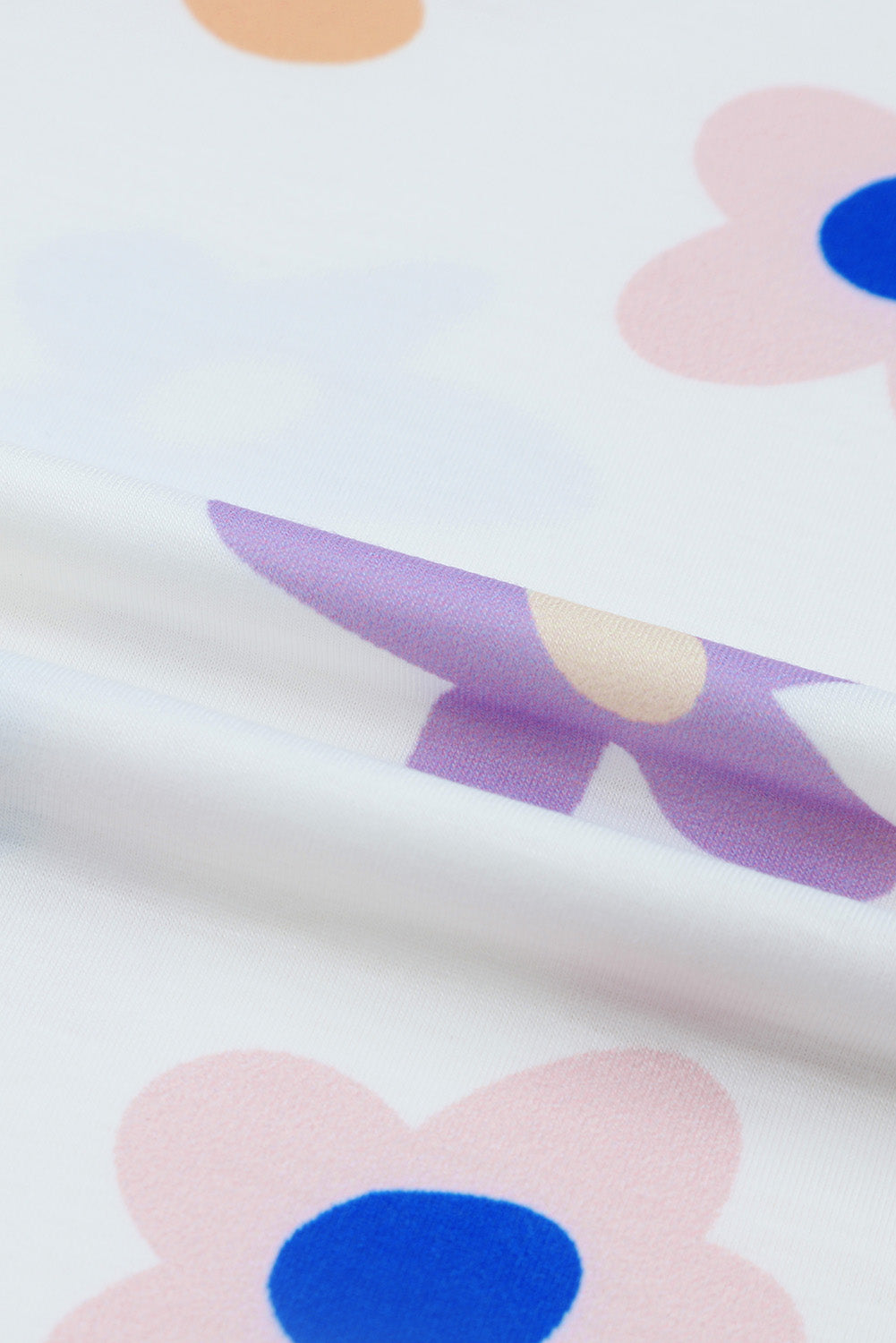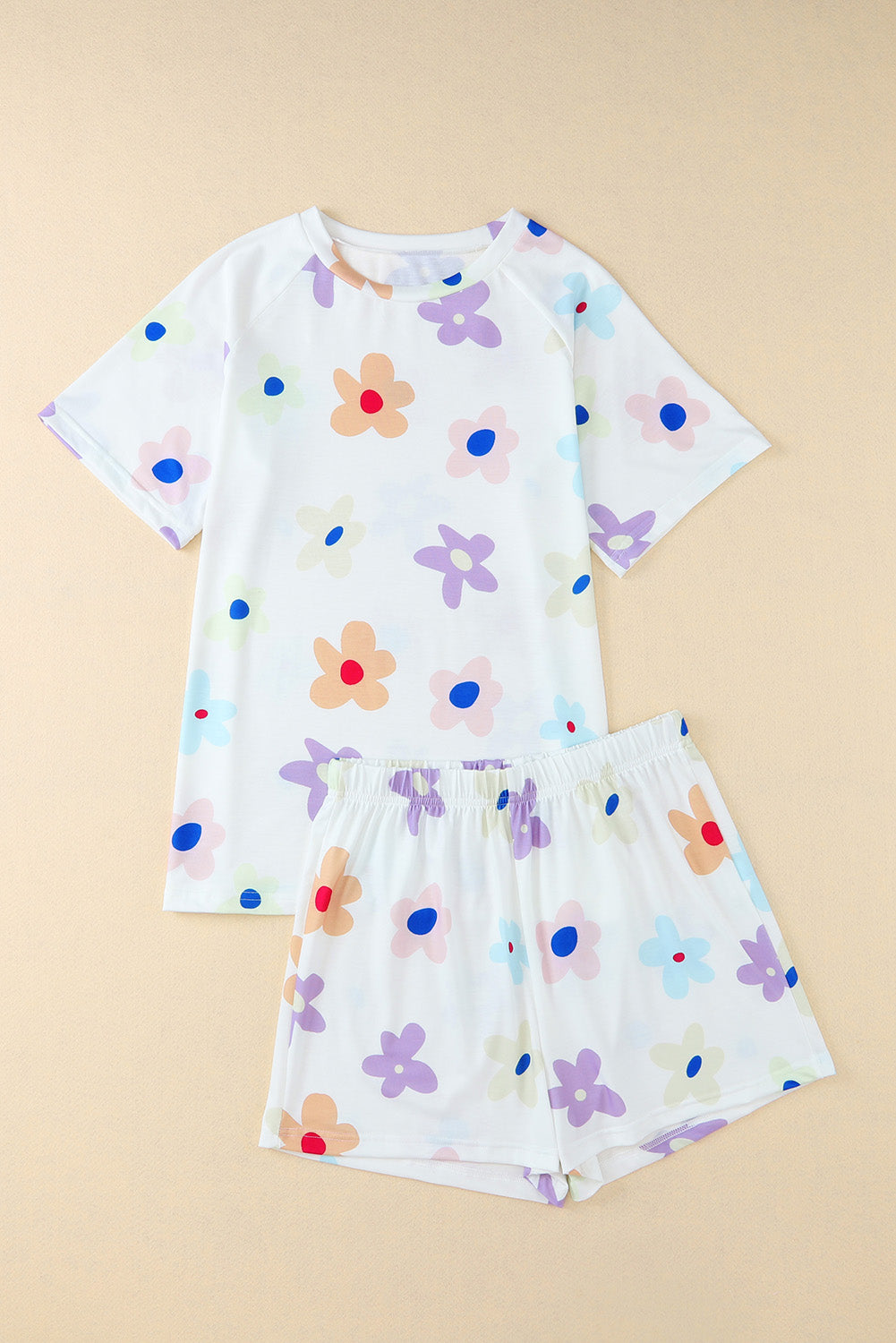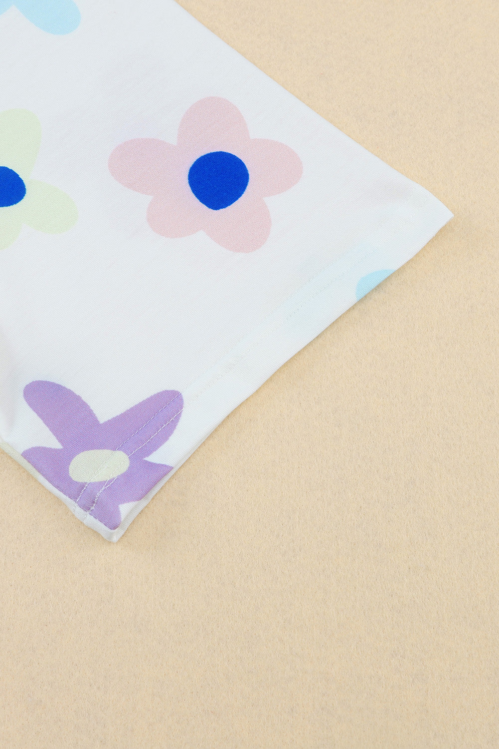 White Flower Print Short Sleeve High Waist Two Piece Shorts Set