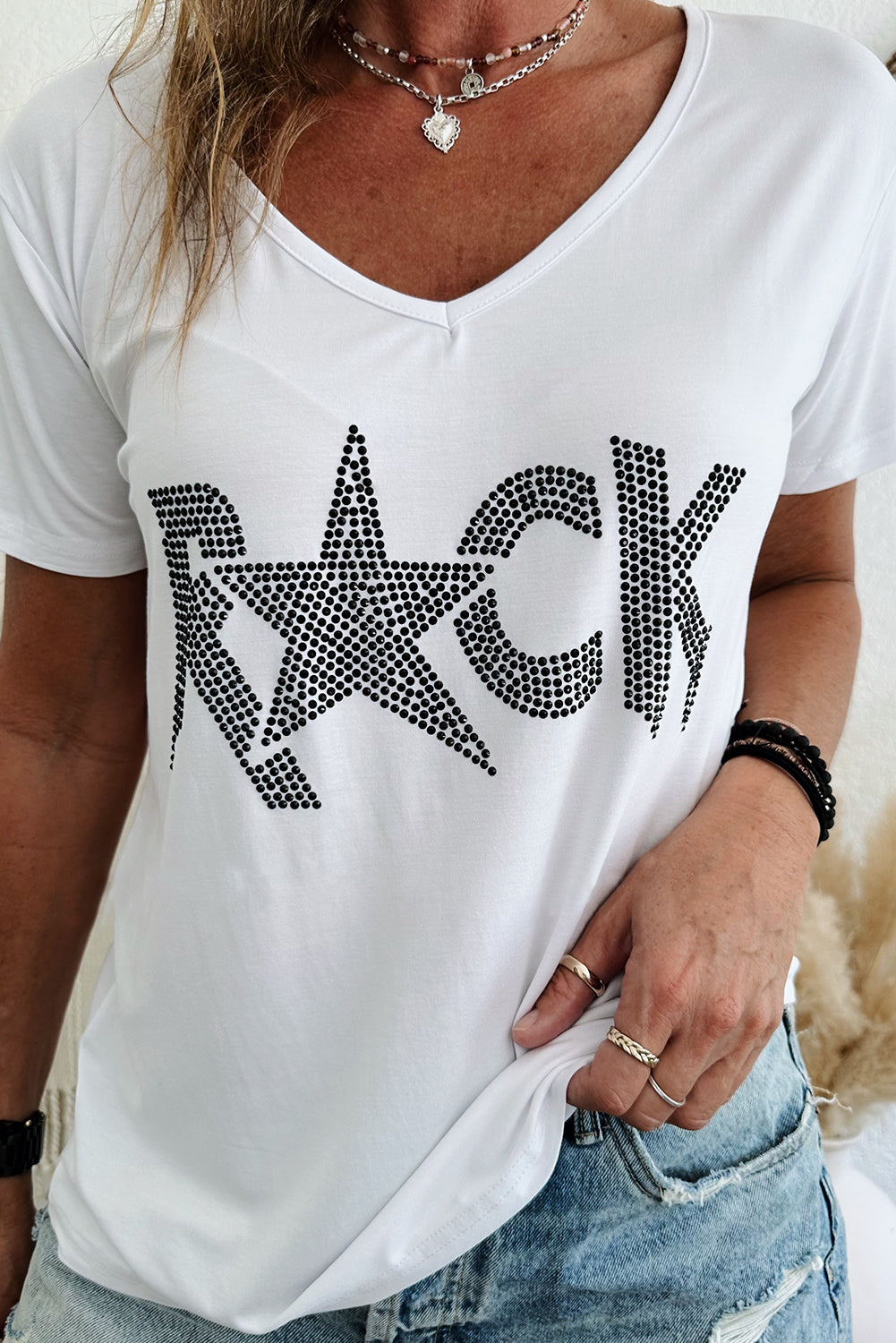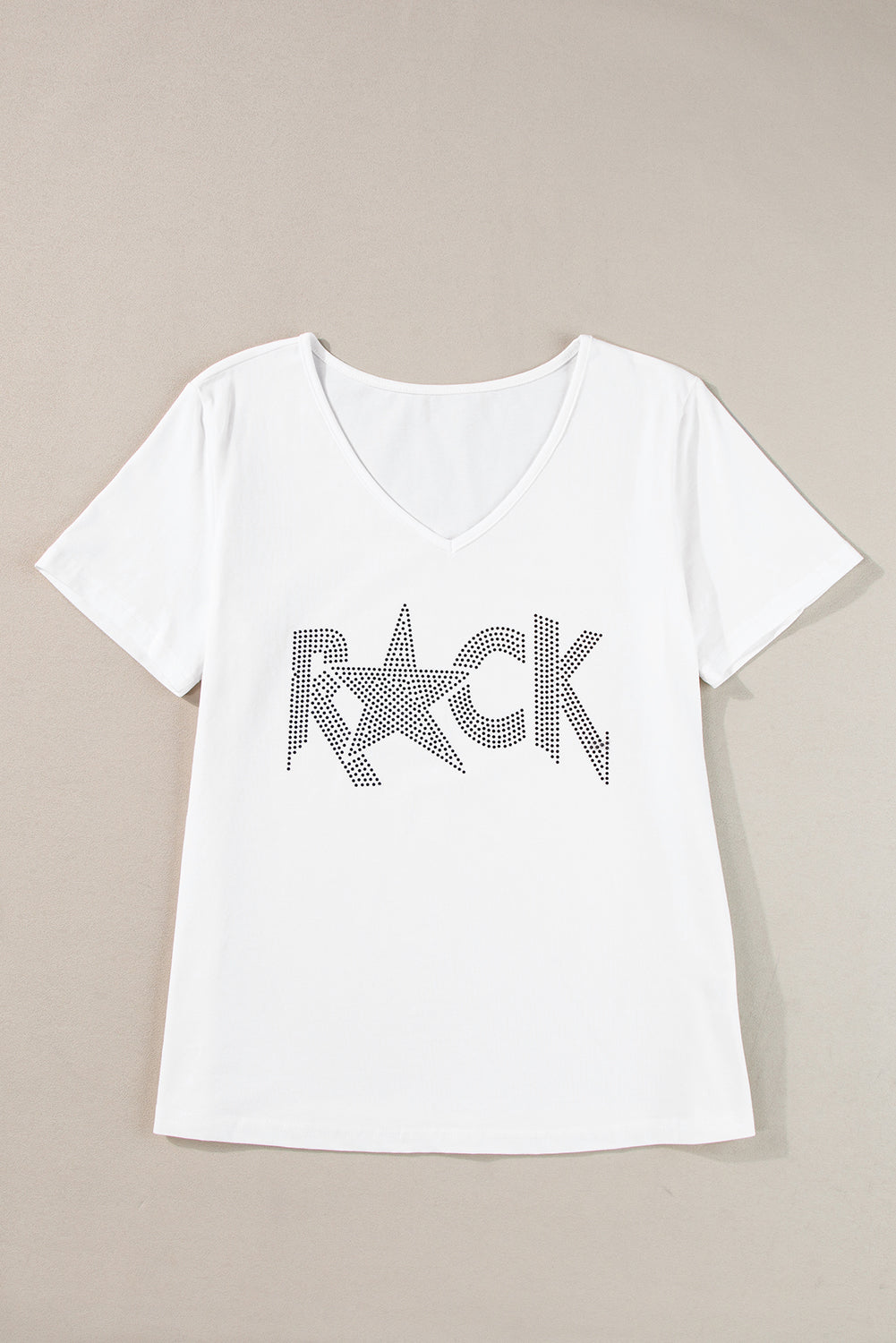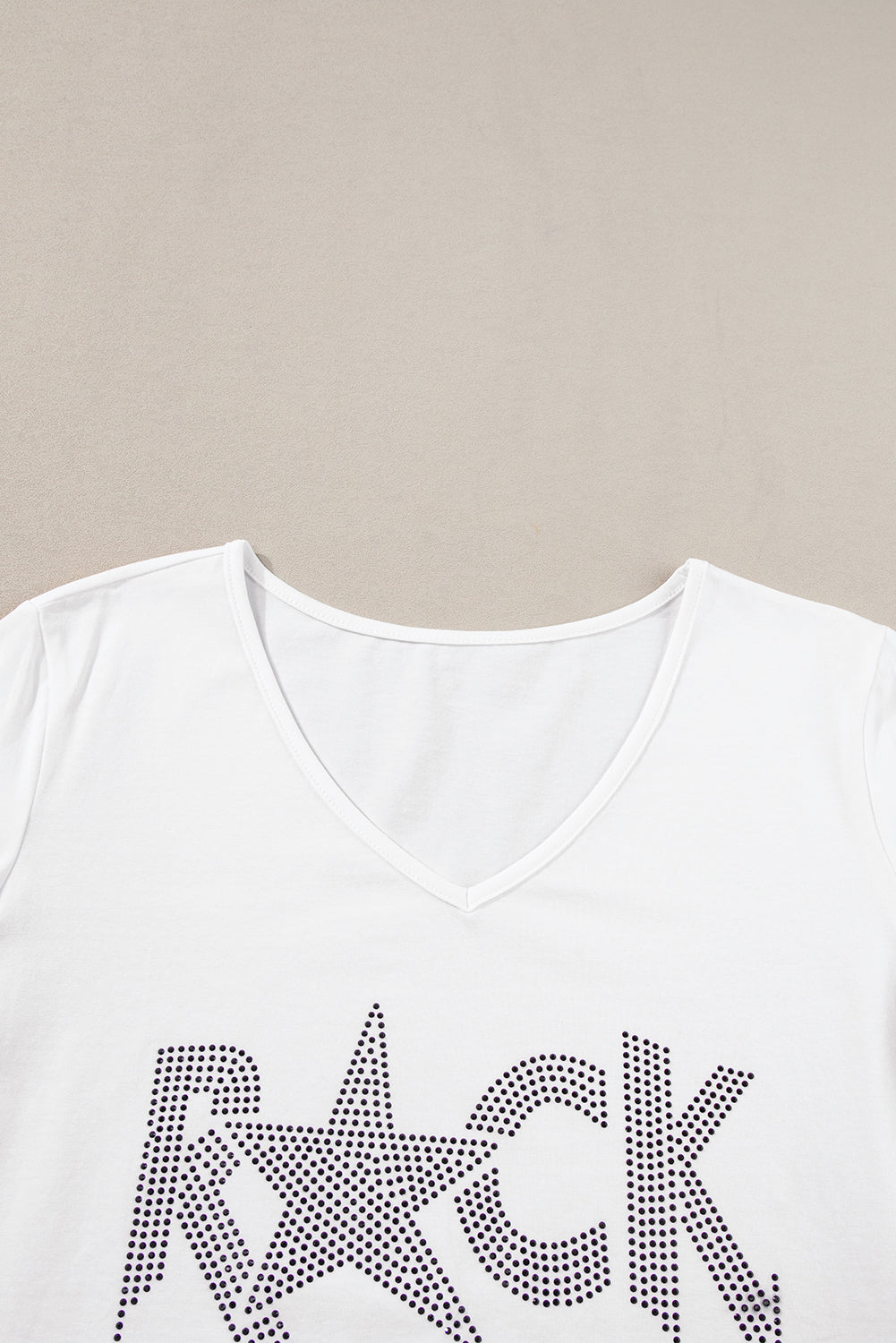 White Rhinestoned ROCK Star Graphic V Neck T Shirt
