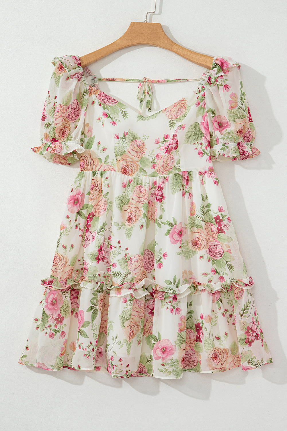 White Vibrant Floral Bubble Sleeve Sweetheart Neck Ruffle Mini Dress